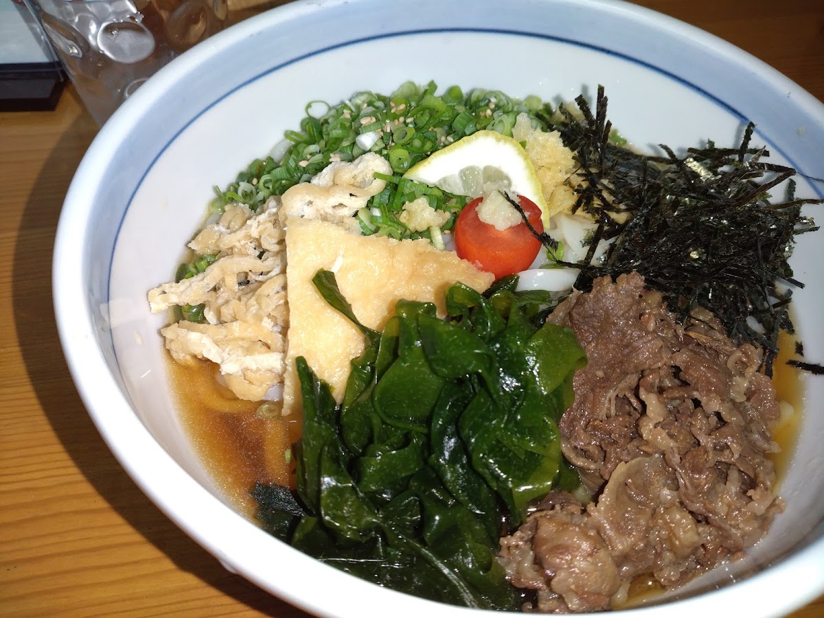 One of the standout dishes at Nakamaru Tobe is the 肉うどん (Nikudon), a hearty bowl of udon noodles topped with tender, thinly sliced beef in a rich broth. The savory flavors make it a favorite among regulars and newcomers alike. For those who enjoy a bit of variety, the 五目うどん (Gomoku Udon) is an excellent choice, featuring a mix of seasonal vegetables and protein-packed ingredients in a warm, flavorful broth.