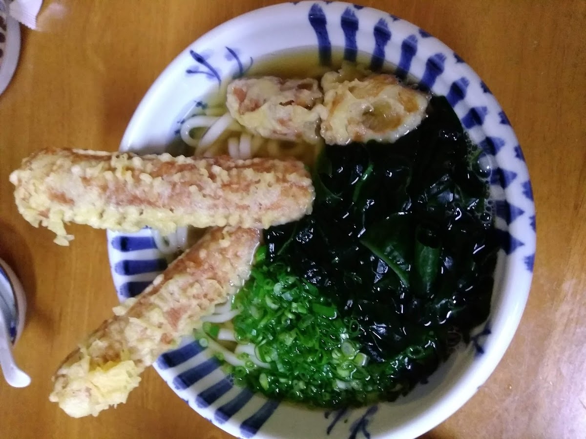 If you're in the mood for something with a bit more of a comforting twist, the 鍋焼きうどん (Nabeyaki Udon) will hit the spot. This dish is served in a hot pot, with noodles, vegetables, and a perfectly poached egg that adds a creamy texture to the already rich flavors. But what truly sets Nakamaru Tobe apart is its ちくわ天トッピングワカメうどん (Chikuwa Tempura Udon), where crispy chikuwa (fish cakes) tempura is placed atop a bowl of udon noodles, paired with fresh seaweed and a broth that will have you coming back for more.